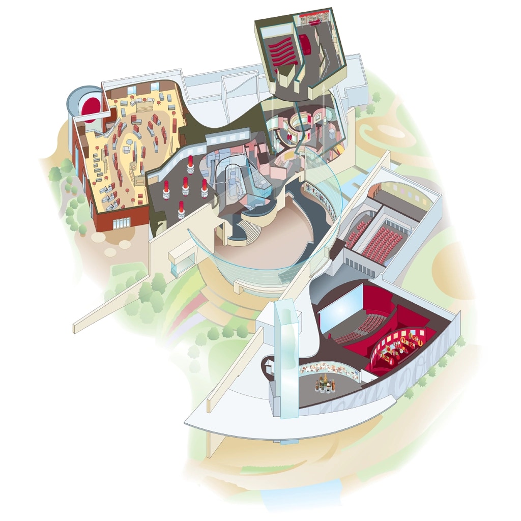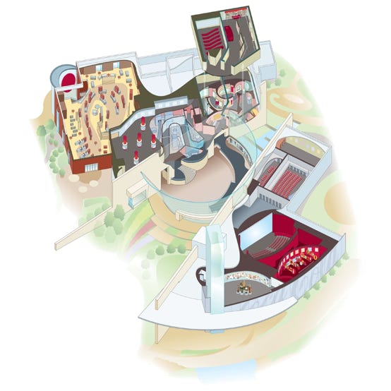 Present the program as a part of rural and urban environments where users can create their own experience as they venture through school interiors and grounds, learning how the Family-Friendly Schools program plays a critical role in the community, providing services beyond education. Illustration, design, and code.
