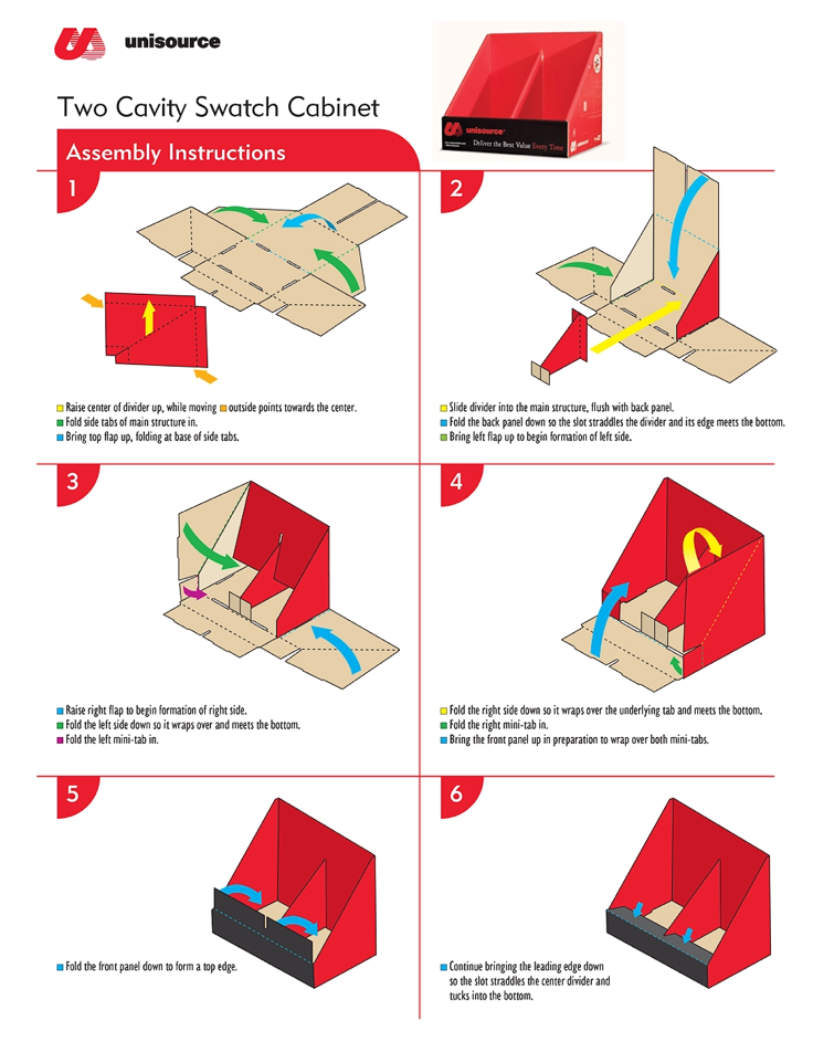 Utilize corporate design components to create an on-brand product story, educating and persuading the audience. Provide a detailed assembly experience in a step-by-step written and visually guided process, educating the user on each step, purpose, and outcome. Utilize product illustrations with strong product likeness and orientation correlating to each step. Design, illustration, and copy writing.